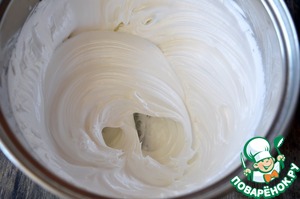 Яичные белки взбиваем до мягких пик и тонкой струйкой вводим сахарный сироп, не прекращая взбивать массу. Продолжаем работать миксером еще в течение 5 минут, чтобы масса остыла до комнатной температуры и увеличилась в объеме. Пики должны быть уже устойчивыми!!!
