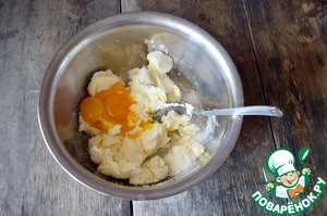Размягченное сливочное масло соединяем с сахаром и хорошо растираем. Добавляем желток. -