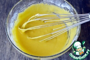 Яичные желтки соединяем с сахаром (10 г), мукой и крахмалом. Хорошо перетираем венчиком до однородности.