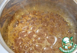 Соединяем в сотейнике воду с сахаром (75 г) и глюкозой. Если нет глюкозы - не беда! Все получится и так! Ставим на огонь и доводим до состояния карамели! Ни в коем случае не мешаем ложкой, если есть необходимость то можно покачивать кастрюлькой из стороны в сторону! -