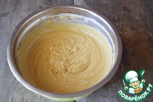 Поверх грушевого слоя выкладываем остывший карамельный заварной крем, аккуратно разравниваем лопаточкой.