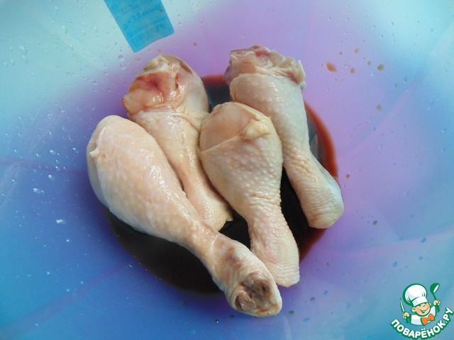Делала на двоих и на один раз, поэтому курочки немного) Берем наши голени и замачиваем их на час в соевом соусе. Периодически ворочаем, чтоб равномерно мариновались.