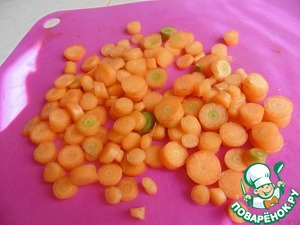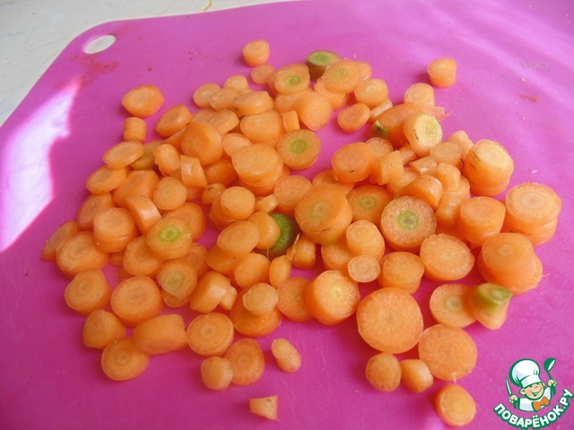 Пока в сковороде "отдыхают" ноги с луком режем морковь. Если мелкая то кружочками, если покрупней - соломкой. Я резала не очень тонкими кружками)