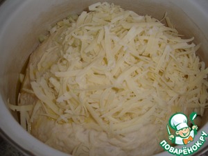 Когда тесто хорошо подошло, режем достаточно мелко луковицу, сыр трём на крупную терку.