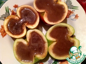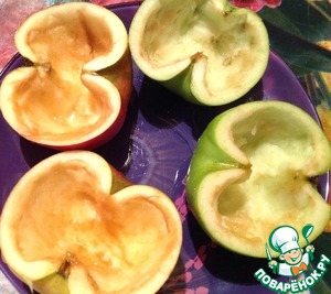 Яблоки моем, разрезаем пополам и делаем с них лодочки, оставляя несколько мм толщиной стенки.