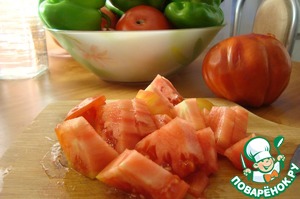 Берём сотейник с высокими бортами и толстым дном. Режем произвольно помидоры и отправляем в сотейник.