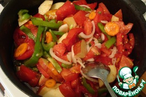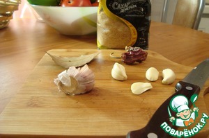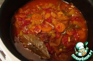 Режем чеснок, перец руками крошим и добавляем всё к овощам, кладём лавровый лист.