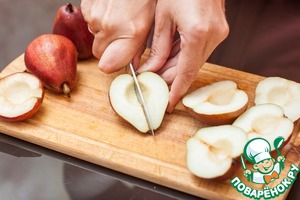 Тем временем небольшие крепкие груши разрезать на четвертинки и удалить семенную коробочку