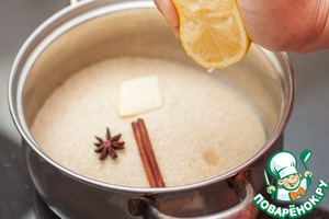 Добавить сливочное масло, палочку корицы, звездочку бадьяна и лимонный сок
