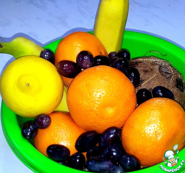 Ингредиенты - мандарины, бананы, виноград, кокос, лимон.