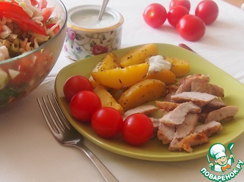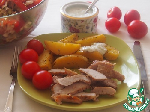Подавать с готовым картофелем и соусом. Можно к этому приготовить еще и овощной летний салат.