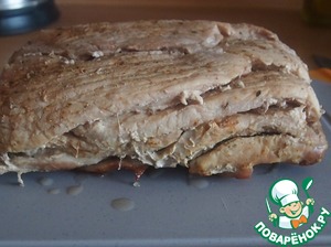 В форму сложить слоями мясо, утрамбовать, поставить сверху груз и мариновать 2-3 часа или оставить на ночь.