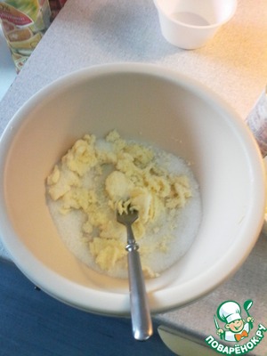 Будем делать два теста. Комнатной температуры масло разтираем с сахаром. (взбивать ненадо)