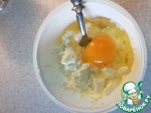 Готовим второе тесто творожное. В творог добавляем яйца (2)шт. сгущенное молоко и ванильный сахар. Перемешиваем.