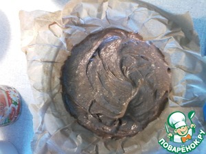 Застилаем разъемную форму пергаментом для выпечки и выкладываемполовину шоколадного теста.