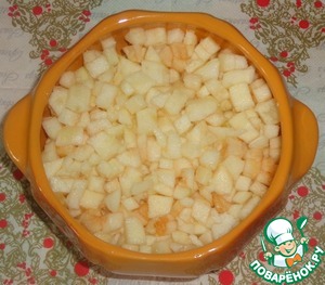 Яблоко очистить и нарезать маленькими кубиками. Яблоки присыпать тростниковым сахаром.
