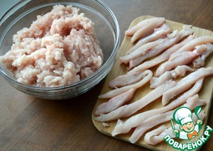 Оставшиеся 100 грамм филе нарезать на тонкие полосочки. -