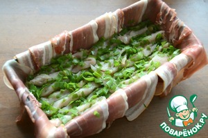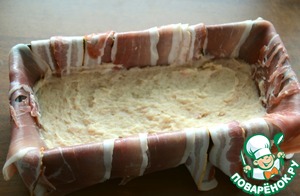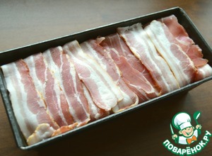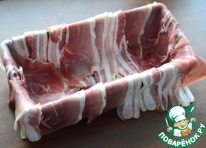 Выстилаем нашу форму беконом так, чтобы концы бекона свисали