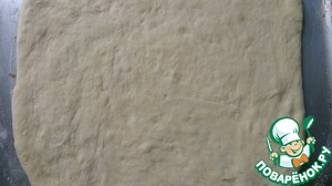 Когда тесто увеличится в разы, разделить его на две части. Раскатать одну часть теста в пласт и выложить на противень или форму большого диаметра.