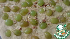 Выложить на тесто, ранее подготовленную часть нашей масляно -сахарной массы и виноград.