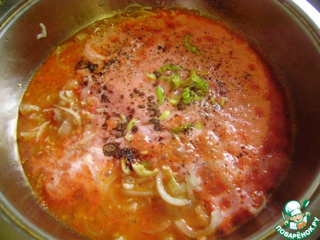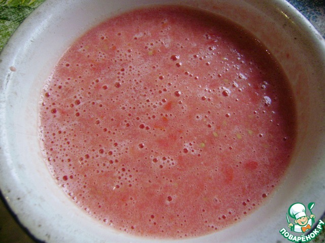 Пока сезон помидоров, я взяла свежие и перебила блендером. Если готовим зимой, то берем томаты в собственном соку или свои заготовки томатного сока. Если ничего нет, то берем 1 ст. л. томатной пасты и разводим в стакане воды.