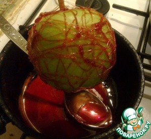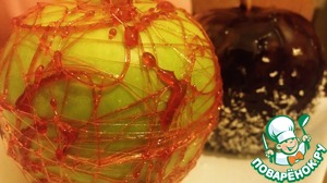 2) Дождаться пока карамель немного затвердеет. Делаем карамельные нити вокруг яблоки.