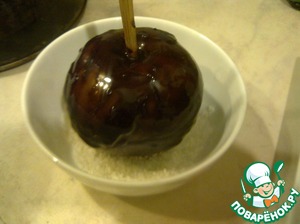 3) Растопить шоколад. Покрыть яблоко шоколадом, затем обвалять в кокосовой стружке