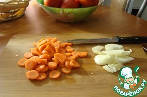• Режем лук и морковь произвольно. Тоже отправляем в сотейник.