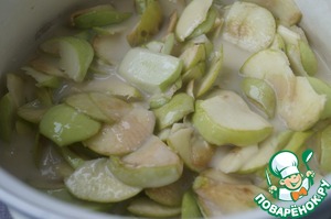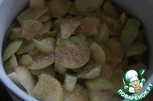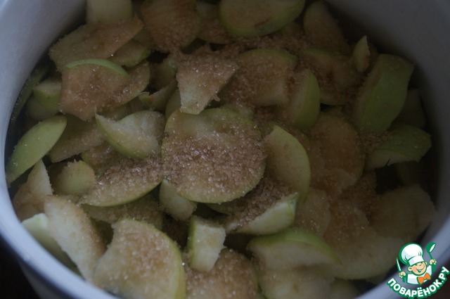 • Яблоки нужно подготовить заранее. Для этого яблоки моем и режем тонкими дольками, можно яблоки очистить. Пересыпать яблоки сахаром, накрыть емкость крышкой и дать настояться 1-2 часа.