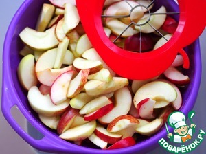 Яблоки нарезать на тонкие дольки. Я это делала и ножом, и яблокорезкой. Крупные делила на 12 частей, мелкие на 8.