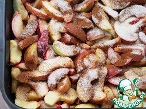 Плотно уложить нарезанные яблоки на противень, посыпать их корицей, лимонной кислотой и сахаром (около 50г оставить на окончательную посыпку), хорошенько перемешать. Поставить в разогретую до 200 градусов духовку на 25 минут.