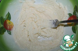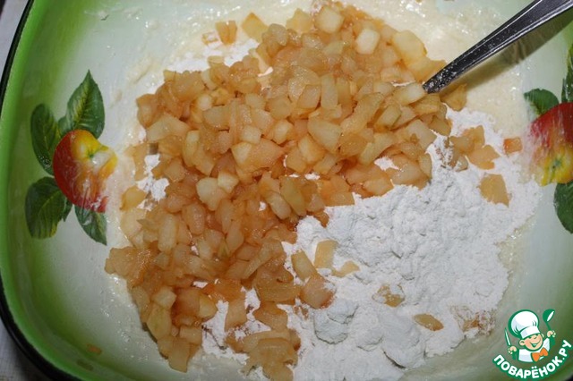 Ввести муку, разрыхлитель теста и яблоки, вымесить тесто.