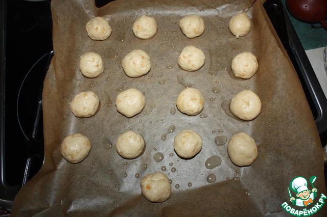Противень застелить бумагой, смазать маслом. Из теста сформировать шарики, выложить на противень