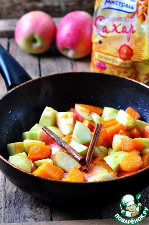 • Добавить яблоки, слегка обжарить, влить вино, добавить сахар, соль, перец, корицу. Когда вино слегка выпарится, добавить печень, перемешать, попробовать на вкус. Следите чтобы яблоки с тыквой не превратились в кашу.
