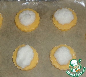 Добавить желтки, разрыхлитель теста и муку. Замесить тесто. Тесто поместить в холодильник на 15 минут.