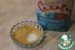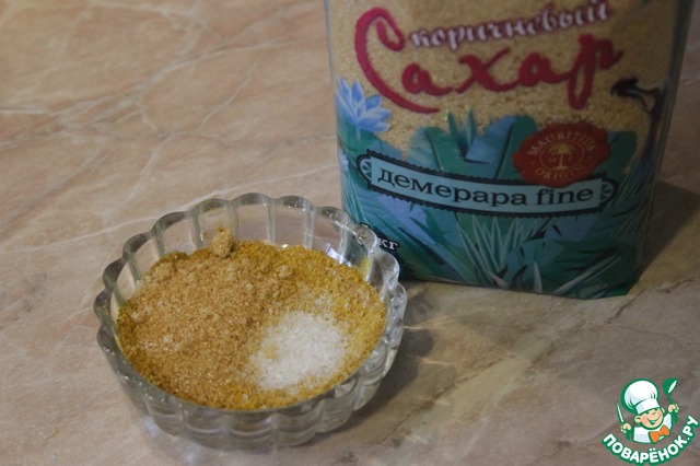 Приправу смешать с сахаром и солью. Это был эксперимент с коричневым сахаром, как оказалось, удачный.