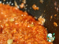 Дальше - все просто. Закидываем в раскаленное масло вначале морковь, мешаем, минут через 10 отправляем туда лук, мешаем, а потом и все натертые кабачки и помидоры отправляем туда же. Добавляем томатную пасту. После этого добавляем порционно соль, мешаем и пробуем. Ориентировочно - 3-4 столовые ложки, но это дело вкуса - должно быть посолено так, как Вы обычно солите, например, суп. Высыпаем весь сахар. Мешаем. И, тоже порционно, льем уксус. На вкус икра не должна быть слишком кислой, но и не пресной. Скорее - кисло-сладкой. Мешаем.