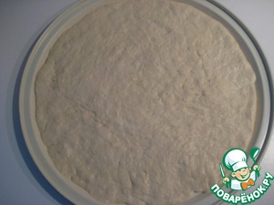Подошедшее тесто обмять, разделить на 2 части. Из этого количества получается 2 тоненькие пиццы.