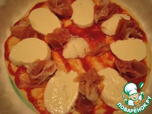 Выложить моцареллу и прошутто на тесто, присыпать слегка тертым пармезаном. Выпекать 10 минут.