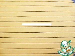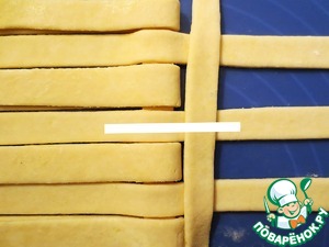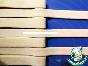 Раскатать тесто, ножом для пиццы разрезать на полоски, шириной 1 см. -