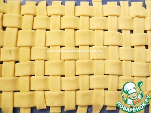 Затем одну полоску из теста положить перпендикулярно остальным.