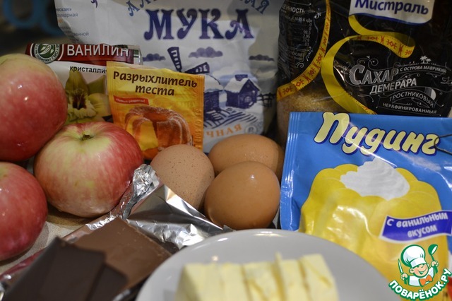 Необычное сочетание шоколада с ванильным пудингом, а под ним кусочек яблочка... Первый раз готовила пудинг из пакетика- процесс оказался интересным- из белого порошка получилась желтоватая масса с приятным ванильным ароматом, которая загустела по мере помешивания.