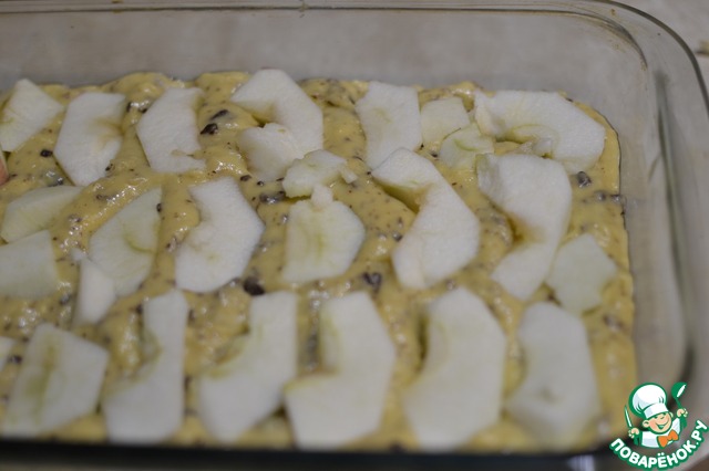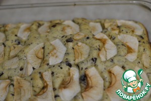 Очищенные и порезанные яблоки (я порезала покрупнее, что бы яблочки ощущались) выкладываем на тесто, слегка прижимая и отправляем в предварительно разогретую до 180 град С. духовку. Надо сказать, что тесто получилось достаточное плотное, наверное, можно было положить поменьше муки.