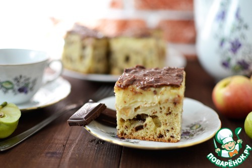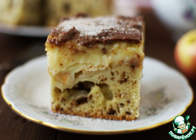 Готовый остуженный пудинг наносим на тесто с яблоками и отправляем в холодильник часа на 2. Затем остуженный пудинг поливаем растопленным шоколадом. У меня этот процесс пошел как-то не так (шоколад комковался и не хотел растекаться) поэтому я не сфотографировала.