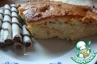 Масло сливочное растапливаем на водяной бане и тонкой струйкой, постоянно помешивая, вливаем в смесь. Просеиваем муку с разрыхлителем туда же. Все хорошо перемешиваем венчиком.