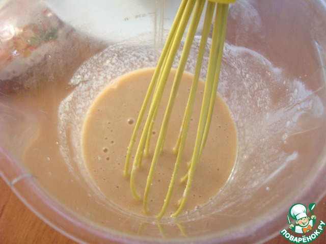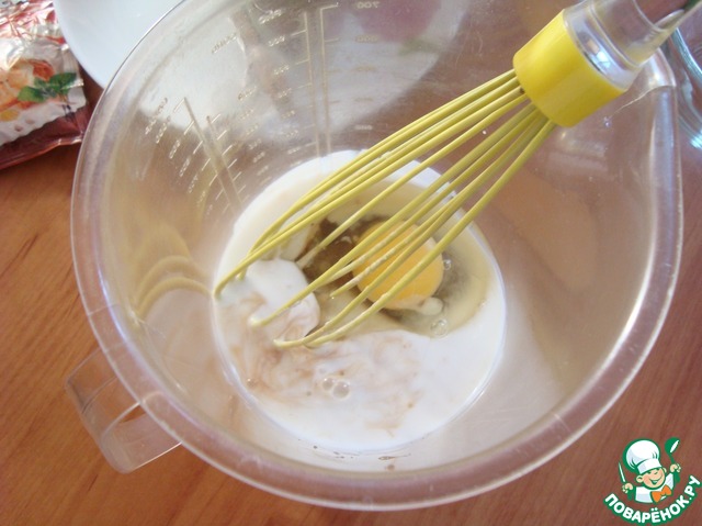 В мерную кружку выливаем кефир, добавляем яйцо и сахар. Всё соединяем венчиком.