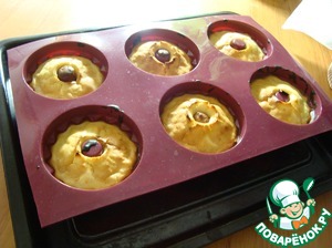 Берём формочки для кексов. Я взяла силиконовую форму на 6 шт. Намочила её и разлила тесто. Формочки не заполнять до верха, тесто поднимаетя!!! Заполнить примерно на 2/3 формы. Поставила в духовку разогретую на 15 минут при т-180С. Проверила зубочисткой. Ориентируйтесь на свою духовку. У меня духовой эл. шкафчик на 15 л. Печёт быстро.