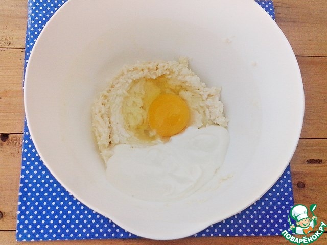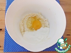 Во взбитую массу положить сметану и яйцо и опять взбить.