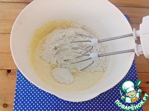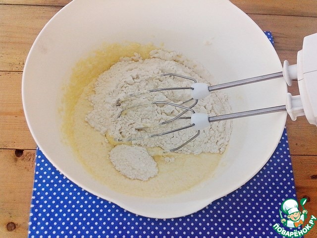 Высыпать разрыхлитель и постепенно всыпать муку. Замесить тесто.
