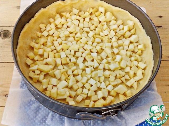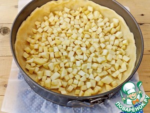 Яблоко очистить от кожуры и семенной коробочки, нарезать мелкими кубиками. Достать форму с тестом из холодильника и выложить нарезанные яблоки.